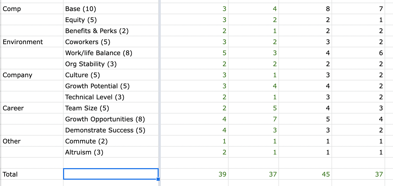 The weights give this system a high degree of flexibility without enforcing arbitrary ordering. More often than not, factors that go into a job decision aren't meaningfully comparable, and I cannot find a good way to definitively put a set of criteria in some absolute stack rank of importance. For example, a decade ago, I cared about joining an altruistic mission as much as not being reorg'ed all the time, which is abstractly less important than joining a rocketship, but it also depends on the strength of that mission. Then again, none of this is scientific; it's a quantification of a complex set of subjective opinions, broken out into individual parts so they can be reasoned as a standalone dimension.