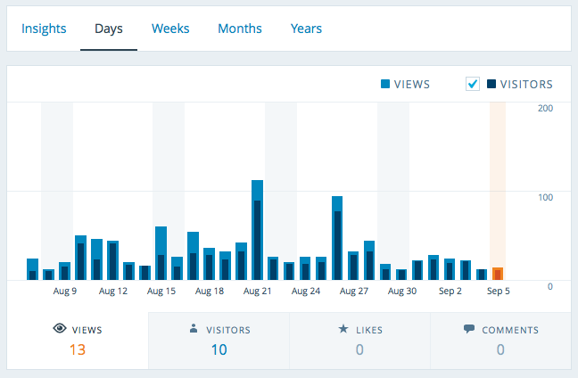 Of course, the problem lies with the amount of traffic – or, the lack thereof – that this blog receives. I’ve never bothered trying to optimize for traffic[1], and beyond a handful of posts to Hacker News, the viewing stats remain unsurprisingly modest:
